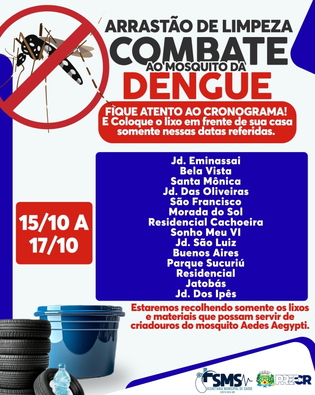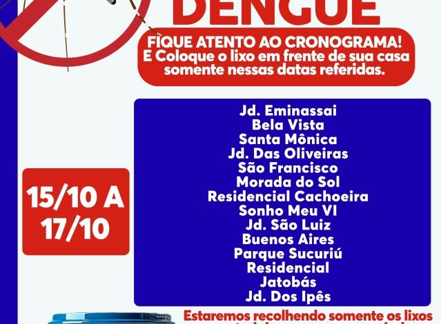 Durante o mutirão, os moradores são orientados a colocar lixo e materiais inservíveis em frente às suas casas apenas nas datas programadas. A coleta se concentrará em itens que possam servir como criadouros para o mosquito, como pneus, baldes, copos e garrafas que acumulam água.