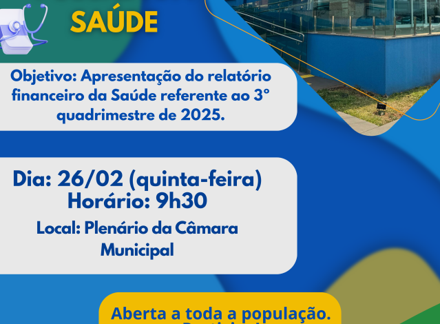 A iniciativa é promovida pelo Legislativo e o Poder Executivo com o objetivo de garantir transparência na aplicação dos recursos públicos destinados ao setor. Durante a audiência, serão apresentados dados financeiros, investimentos realizados, despesas executadas e demais informações relacionadas à gestão da Saúde no período analisado.