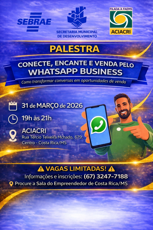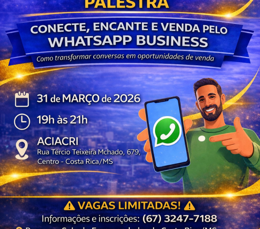 Marcada para o dia 31 de março de 2026, das 19h às 21h, a palestra será realizada no auditório da ACIACRI, situado na Rua Tércio Teixeira Machado nº 679, no Centro. O evento é gratuito, mas as vagas são limitadas. Os interessados devem garantir sua participação o quanto antes, entrando em contato pelo telefone (67) 3247-7188 ou diretamente na Sala do Empreendedor de Costa Rica.