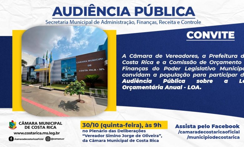 A Câmara Municipal de Costa Rica realiza na próxima quinta-feira, 30 de outubro, às 9 horas, uma Audiência Pública para apresentar e discutir o Projeto de Lei nº 1.601/2025, que estima a receita e fixa a despesa do Município para o exercício financeiro de 2026.