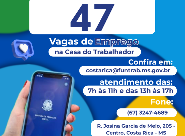 Com isso, a Prefeitura Municipal e a Casa do Trabalhador de Costa Rica procura, por meio dessas vagas, proporcionar emprego à população local e contribuir para o desenvolvimento econômico da região e inserção de profissionais na maioria dos setores.