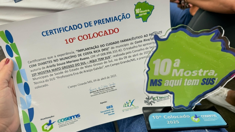 Na quinta-feira, 10 de abril de 2025, o município de Costa Rica se destacou na 10ª Mostra “MS, Aqui Tem SUS!”, realizada na Escola de Saúde Pública Dr. Jorge David Nasser, em Campo Grande/MS. O projeto intitulado “Implantação do Cuidado Farmacêutico ao Paciente com Diabetes no Município de Costa Rica” conquistou a 10ª colocação e garantiu a representação do município e de Mato Grosso do Sul na 20ª Mostra Nacional “Brasil, Aqui Tem SUS”, que ocorrerá em Belo Horizonte/MG de 11 a 17 de junho.