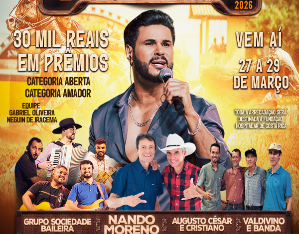 Uma das atrações confirmadas da 1ª Vaquejada de Mato Grosso do Sul, o cantor Nando Moreno gravou um convite especial ao público de Costa Rica e região. Em mensagem direcionada aos fãs, o artista anunciou que sobe ao palco no dia 28 de março de 2026, destacando que prepara um “super show” para o evento. Nando reforçou o convite para que a população participe da festa e afirmou que está chegando para celebrar junto com o público essa edição histórica da vaquejada no Estado.