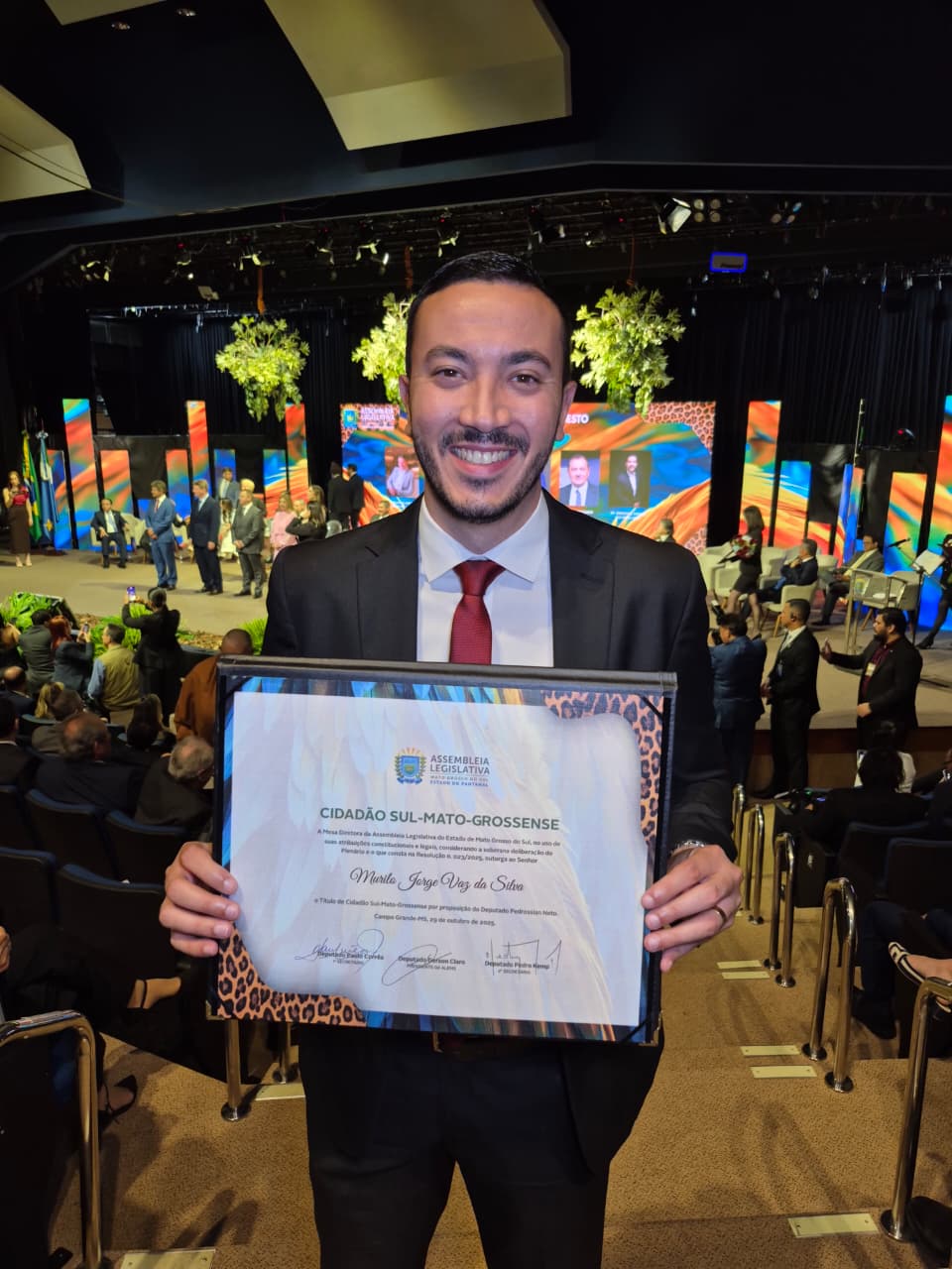 Em uma noite marcada por emoção, reconhecimento e celebração, o prefeito de Pedro Gomes, Delegado Murilo, recebeu nesta quarta-feira (29) o Título de Cidadão Sul-Mato-Grossense, concedido pela Assembleia Legislativa de Mato Grosso do Sul (ALEMS). A honraria foi entregue pelas mãos do deputado Pedro Pedrossian Neto durante cerimônia no auditório Manoel de Barros, no Centro de Convenções Rubens Gil de Camillo, em Campo Grande.