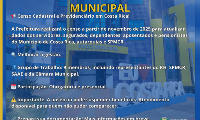 O Censo Cadastral Previdenciário, fundamental para a organização e fiscalização da programação previdenciária, será coordenado por um Grupo de Trabalho composto por nove membros. Dentre eles, cinco representantes do Serviço de Previdência Municipal de Costa Rica (SPMCR), dois do Departamento de Pessoal da Prefeitura Municipal, um do Serviço Municipal de Água e Esgoto (SAAE) e um da Câmara Municipal de Costa Rica. Essa estrutura visa garantir uma gestão eficiente e transparente dos recursos previdenciários, promovendo um melhor atendimento à população.