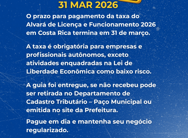 A Prefeitura de Costa Rica, por meio da Secretaria de Administração, Finanças, Planejamento, Receita e Controle de Costa Rica, alerta empresários e profissionais autônomos sobre o prazo para pagamento da taxa do Alvará de Licença e Funcionamento referente ao exercício de 2026. A data limite para regularização é terça-feira, 31 de março. A taxa é obrigatória para empresas e trabalhadores autônomos que atuam no município, exceto para atividades enquadradas na Lei da Liberdade Econômica como baixo risco (Lei nº 13.874/2019).