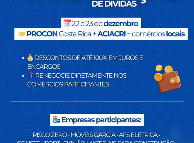 O PROCON de Costa Rica estará à disposição para orientações e informações durante o evento, com atendimento das 7h às 11h e das 13h às 17h. Os interessados podem entrar em contato pelo telefone (67) 3247-1267 ou pelo número 151. Esta é uma excelente oportunidade para quem busca sair das dívidas e iniciar 2026 com o nome limpo e mais tranquilidade financeira.