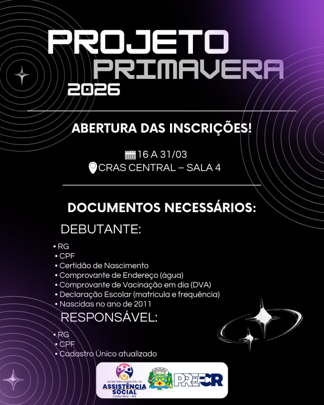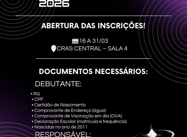 Entre os documentos necessários para a debutante estão RG, CPF, certidão de nascimento, comprovante de endereço, comprovante de vacinação em dia (DVA) e declaração escolar que comprove matrícula e frequência. Já o responsável deve apresentar RG, CPF e Cadastro Único atualizado.
