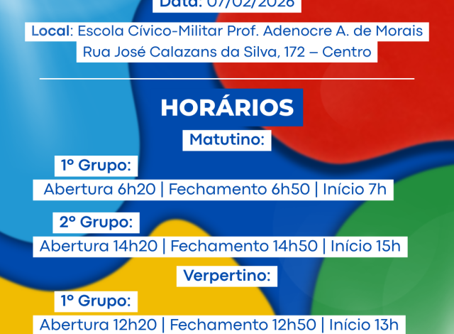 A Prova de Avaliação Psicológica acontecerá no dia 7 de fevereiro de 2026, próximo sábado, na Escola Municipal Cívico-Militar Professor Adenocre Alexandre de Morais, localizada na Rua Jose Calazans da Silva, 172, Centro, em Costa Rica. Os portões serão abertos em diferentes horários, divididos em turnos matutino e vespertino, para a realização dos testes.