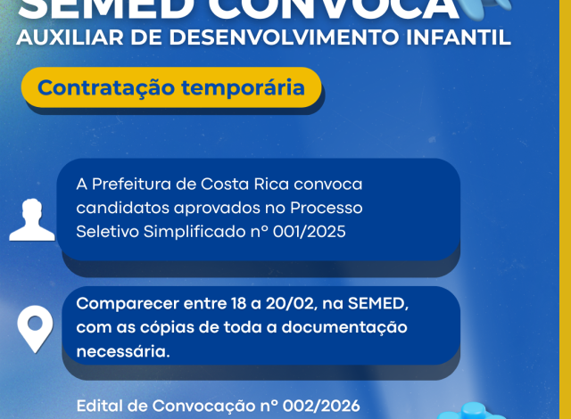COSTA RICA – A Prefeitura de Costa Rica, por meio da Secretaria Municipal de Educação (SEMED), deu início à convocação dos aprovados no Processo Seletivo Simplificado nº 001/2025 para o cargo de Auxiliar de Desenvolvimento Infantil. O Edital de Convocação nº 002/2026 foi publicado oficialmente, e os selecionados devem ficar atentos aos prazos curtos para garantir a contratação.